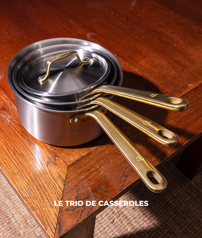 Notre batterie d'ustensiles en inox haut de gamme s'adresse à tous les cuisiniers amateurs ou professionnels. Conçues en inox 18/10 3 plis (multi-couches) les poêles Atma sont idéales pour les cuissons du quotidien : légumes, viandes rouges, viandes blanches, poissons, oeufs, et même fruits. Nos poêles de qualité professionnelle ont été entièrement développées par notre équipe avec notre designer et notre usine partenaire en France. Avec Atma nous voulons vous proposer le meilleur avec des matériaux d'exception et un savoir-faire reconnu.