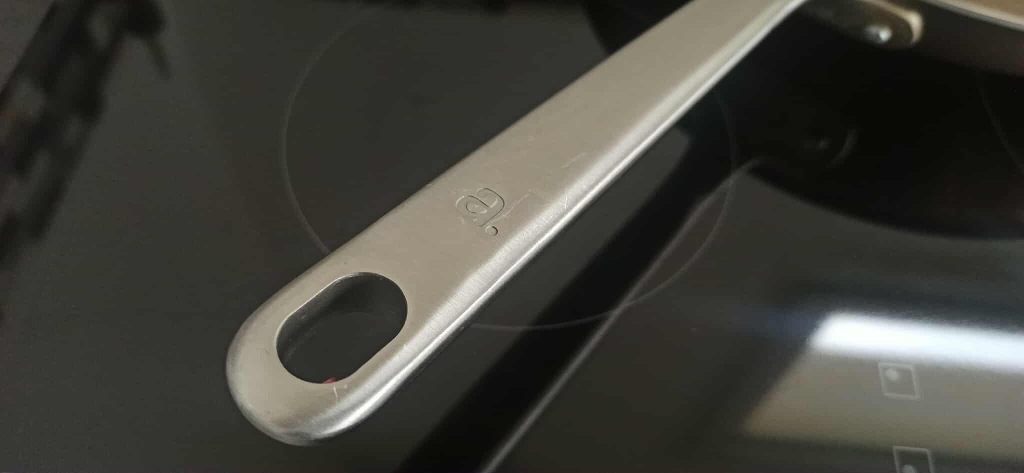 - Une couche d’aluminium encapsulée entre les deux couches d’inox, pour assurer une diffusions rapide et homogène de la chaleur sur toute la surface de cuisson. C’est ce qui va vous permettre à votre poêle de chauffer à haute température. Pas d’inquiétude, la couche d’aluminium est bien scellée entre les deux couches d’inox et donc vos aliments ne seront jamais en contact avec de l’aluminium.