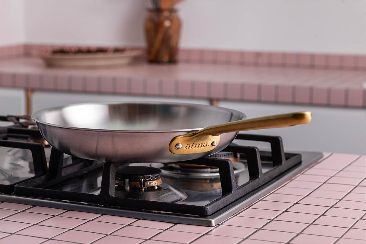 - Atma-Pfannen bestehen beispielsweise aus 3-lagigem Edelstahl. Das bedeutet, sie bestehen aus zwei Schichten 18/10 Edelstahl und einer dazwischenliegenden Aluminiumschicht. Diese Konstruktion sorgt für eine hervorragende Wärmeverteilung und hohe Temperaturbeständigkeit, wodurch Atma-Pfannen perfekt ofenfest sind.