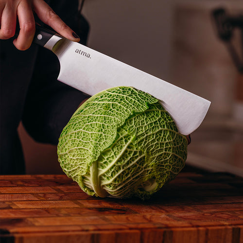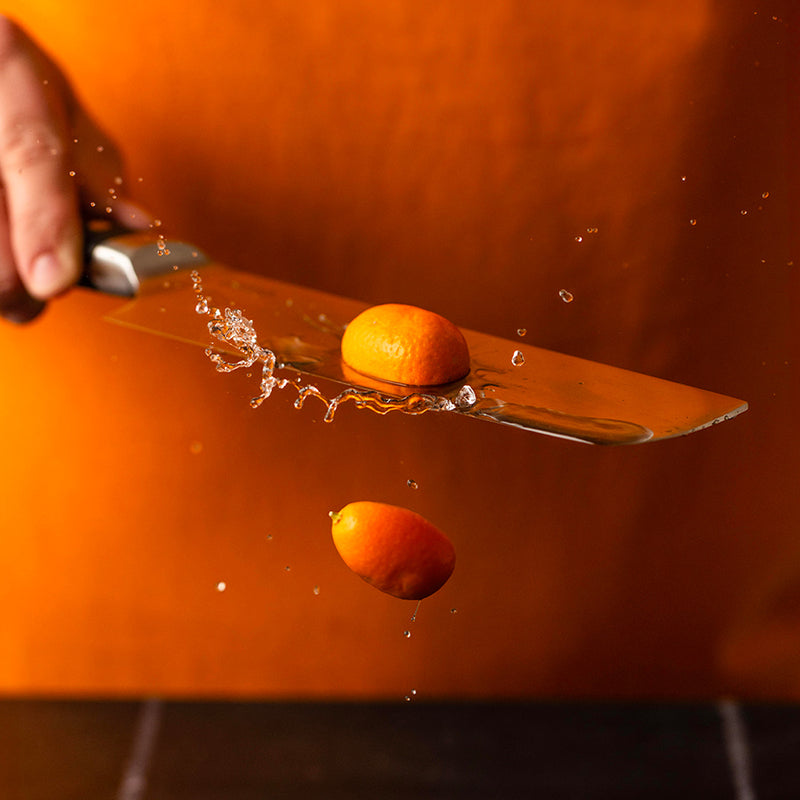 Wir haben uns für eine 58HRC-Stahlklinge entschieden – der perfekte Kompromiss aus Robustheit und Langlebigkeit. Der 30°-Winkel sorgt für sauberes und präzises Schneiden. Sie können Schnittlauch hacken, Ihr Sonntagshähnchen, ein Dorade-Carpaccio oder sogar einen Butternusskürbis tranchieren. Sie schonen Ihre Produkte und sparen viel Zeit.