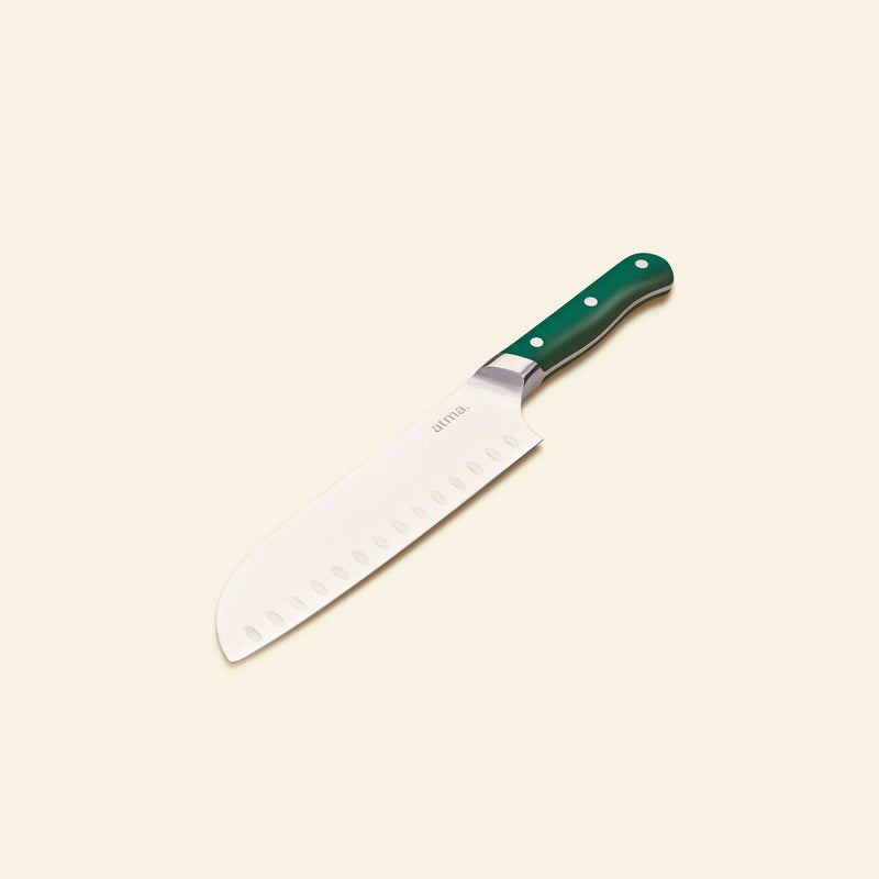 Ce couteau Santoku a une lame de 19,5 cm de longueur et une longueur totale de 30,2 cm avec le manche.
