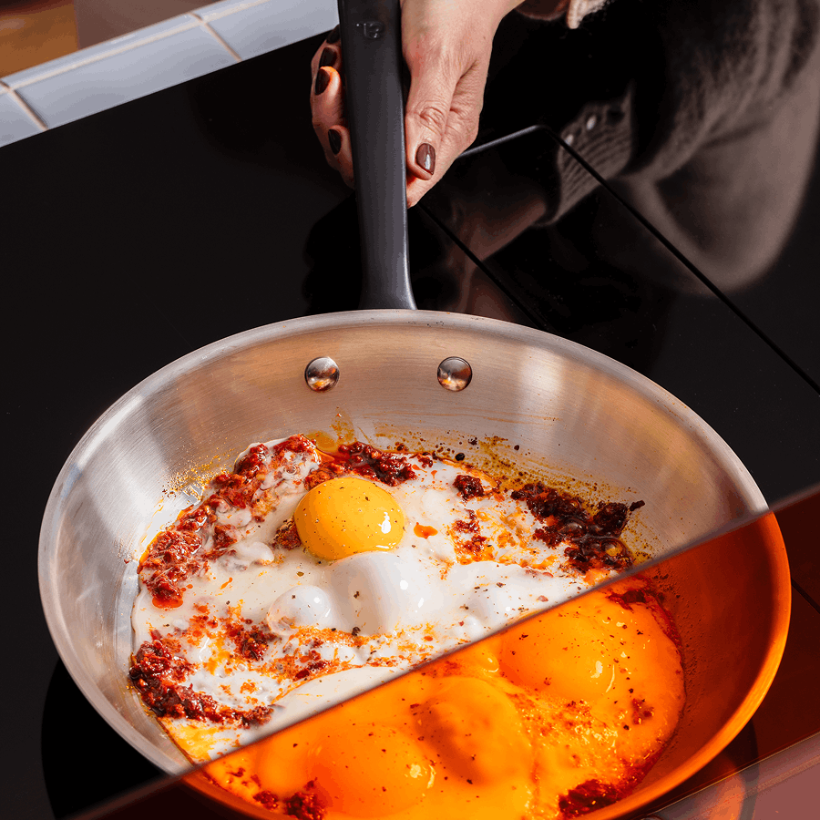 You’ll find articles on our blog packed full of advice on how to master cooking with a stainless steel frying pan and easy tutorial videos on our YouTube channel. You’ll also receive a printed cooking guide for free with your order. In a nutshell: always preheat your pan over a medium heat for two minutes. Complete the water drop test to make sure it’s got up to heat and then add a little oil or butter, unless you’re cooking meat. And never use high heat, Atma’s 3-ply technology gets really hot so you never need it. There you go, you’re all set.