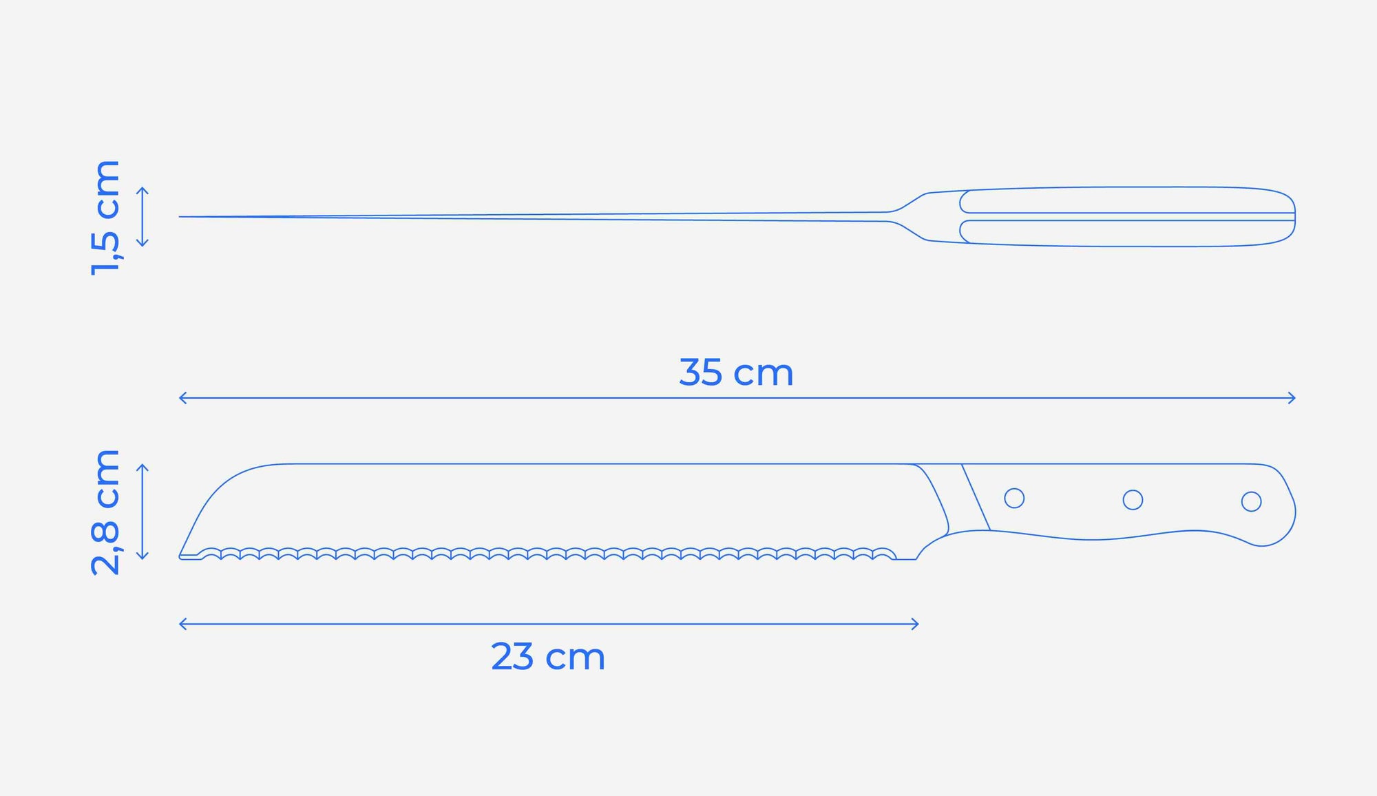 Este cuchillo de pan tiene una hoja de 23 cm de largo y una longitud total de 35 cm incluido el mango.