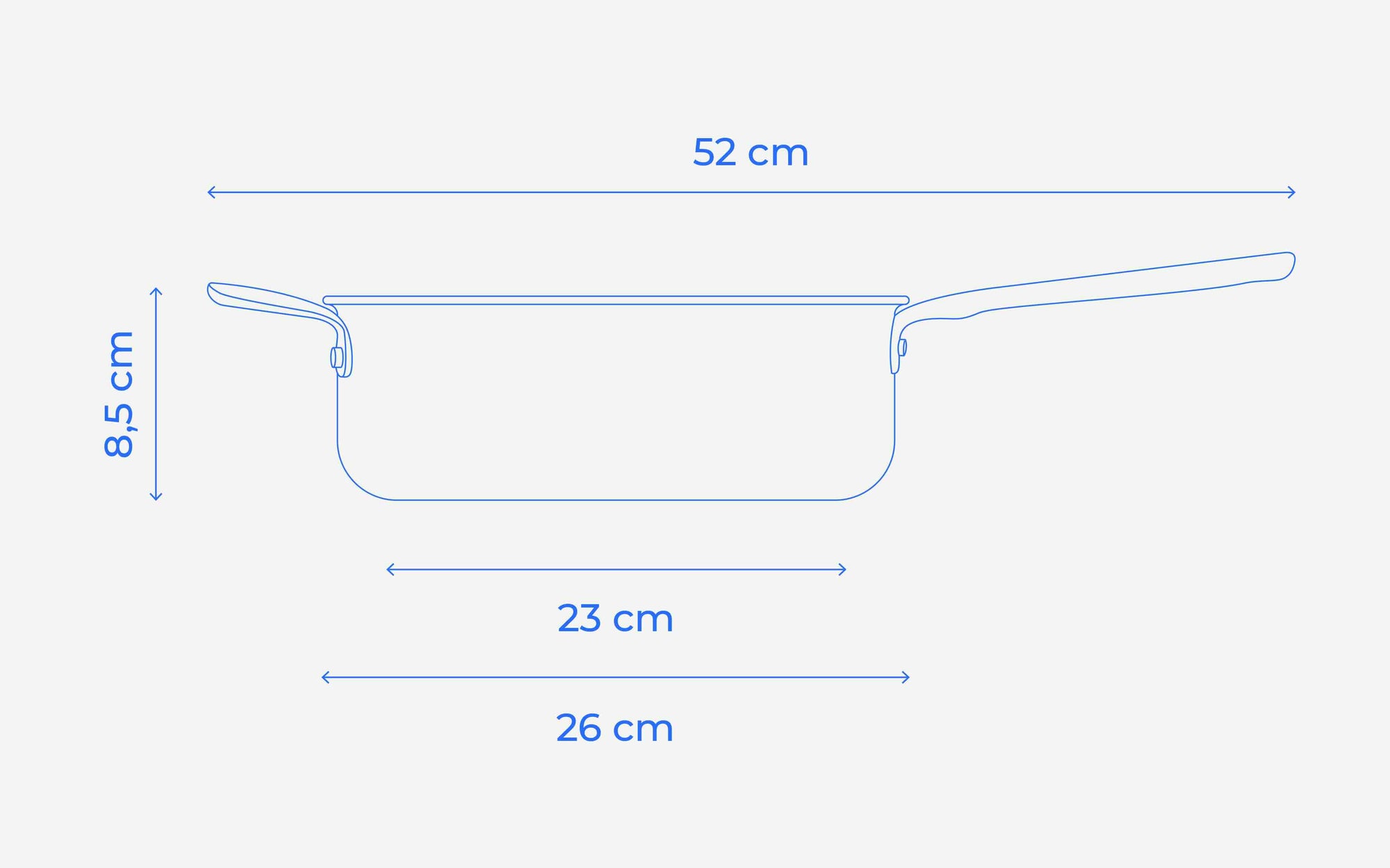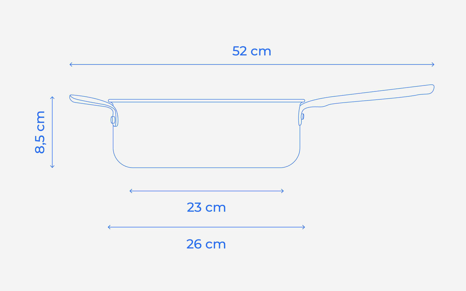 - Una Sauté de 26 cm de diámetro: ideal para 4 o 5 personas. Y le hemos añadido un asa lateral adicional, para ayudarte a transportarla