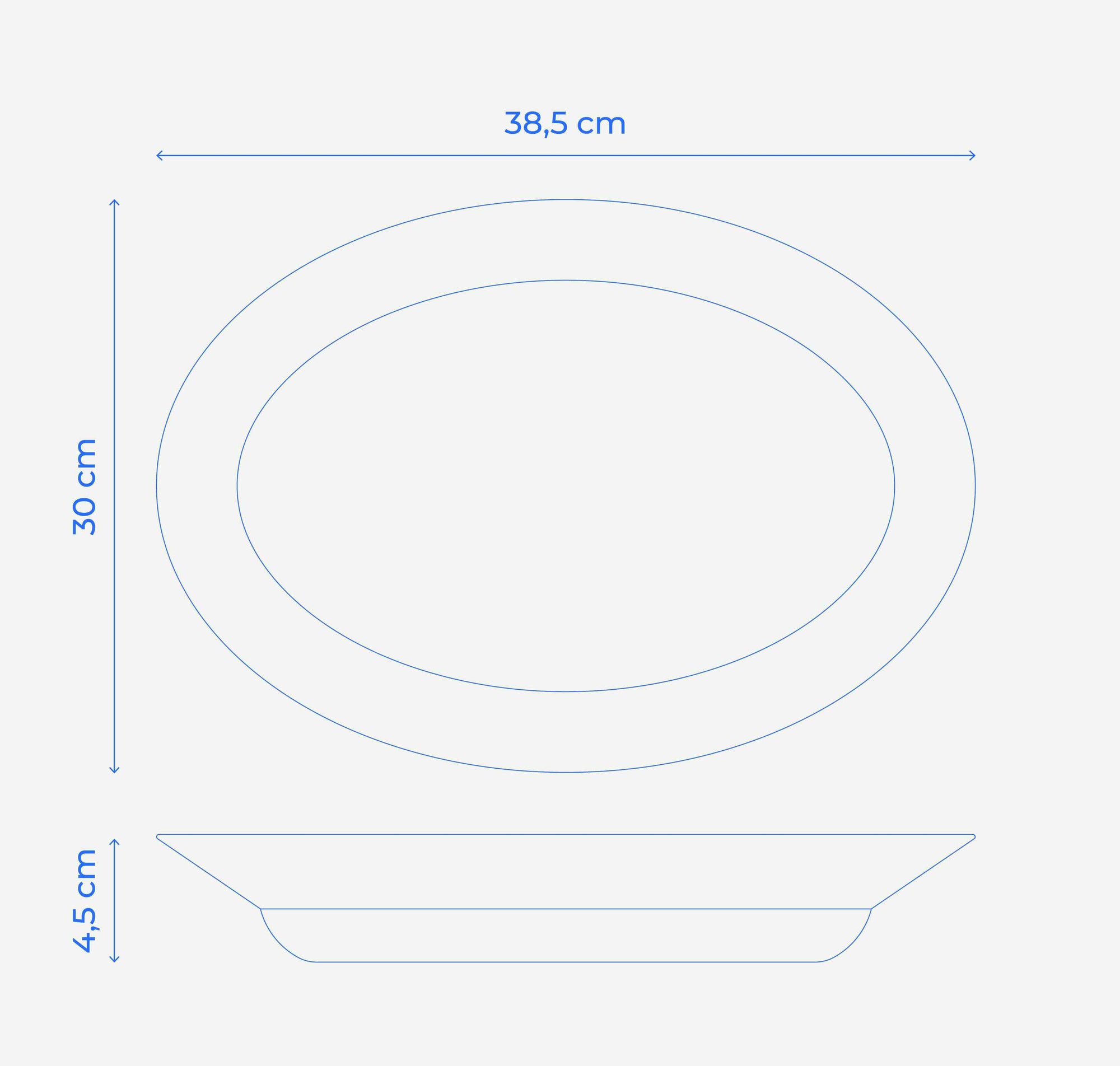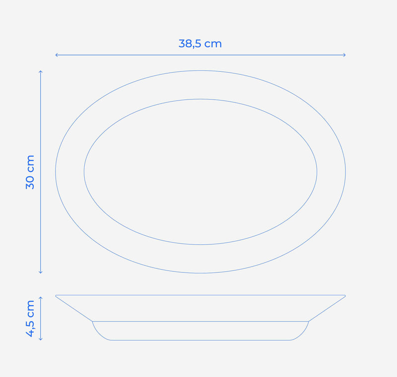 La fuente mide 38,5 x 29,5 x 5 cm. Es ideal para servir hasta 6 personas, ya sea un plato principal, una ensalada grande o un postre generoso.
