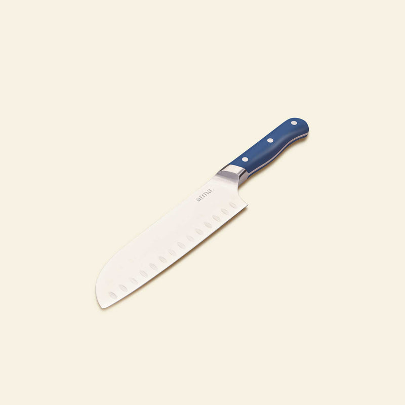 • El santoku y su hoja con hoyuelos, típica de la cocina japonesa
