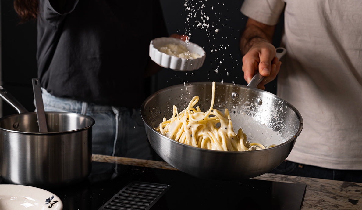 Quienes ya han cocinado con un wok lo saben: se pueden preparar muchas recetas en él. Desde el simple arroz salteado hasta las mejores pastas carbonara de tu vida, porque sí, su forma redondeada permite recubrir perfectamente la pasta con la salsa. Ya verás, este pequeño movimiento de balanceo al estilo Top Chef es adictivo. Se puede estofar una carrillada de ternera, cocer a fuego lento una ratatouille o freír unos nuggets caseros bien crujientes. ¿Te motiva? pues ideal, porque su gran capacidad permite cocinar para muchos comensales.