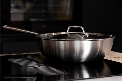 Porque es una aleación que ha revolucionado la cocina y que nos permite ofrecerte sartenes de gran calidad. De hecho, utilizamos acero inoxidable tricapa de 2,3 mm de grosor, compuesto por 3 capas: